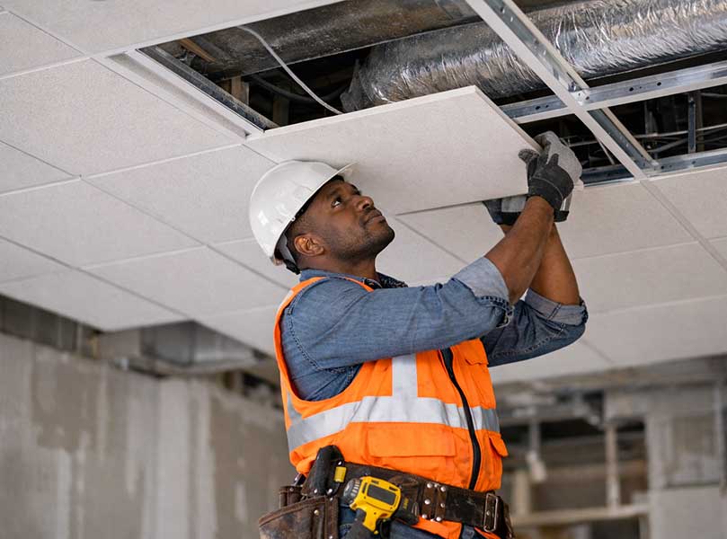 Les plafonds suspendus (faux plafonds) constituent une solution pratique et esthétique pour vos espaces résidentiels et commerciaux. Nous installons des systèmes de plafonds modulaires qui dissimulent élégamment la tuyauterie, les conduits et le câblage électrique tout en offrant un accès facile pour l’entretien. Ces plafonds améliorent l’acoustique des pièces, augmentent l’efficacité de l’éclairage et permettent l’intégration de systèmes de ventilation et de gicleurs. Disponibles dans une variété de textures, couleurs et configurations (tuiles standard, tuiles acoustiques, panneaux décoratifs), ils conviennent particulièrement aux sous-sols, bureaux, commerces et espaces publics. Notre installation professionnelle garantit une structure de support solide, un alignement parfait et une finition soignée qui valorise vos locaux.